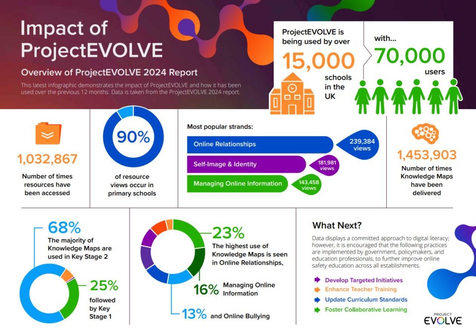 ProjectEVOLVE has made substantial strides in integrating digital literacy education into the UK curriculum, with widespread usage and the data collected by the platform allows us to see a complex picture of its use across the country. The data underscores a clear focus on primary education, with a need for increased engagement in secondary schools, especially on more technical and complex topics