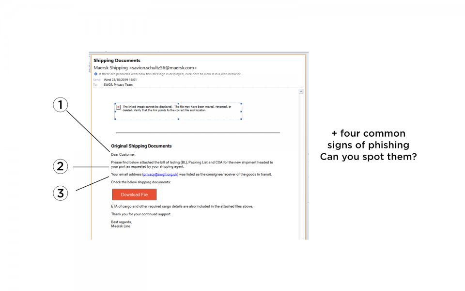 Below is an email we received at SWGfL. We've highlighted three tell-tale signs it was a phishing email, but can you think of the other reasons it was suspicious?